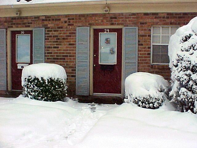 Hey it snowed the first year that I've been here. I think that it's snowed more here than back at home in the mountains. We took pictures this morning (Jan 3) so that we would have proof. It's started to sleet some too. Lee Ann stayed home because it was nasty out. Everything else around here is closed too.